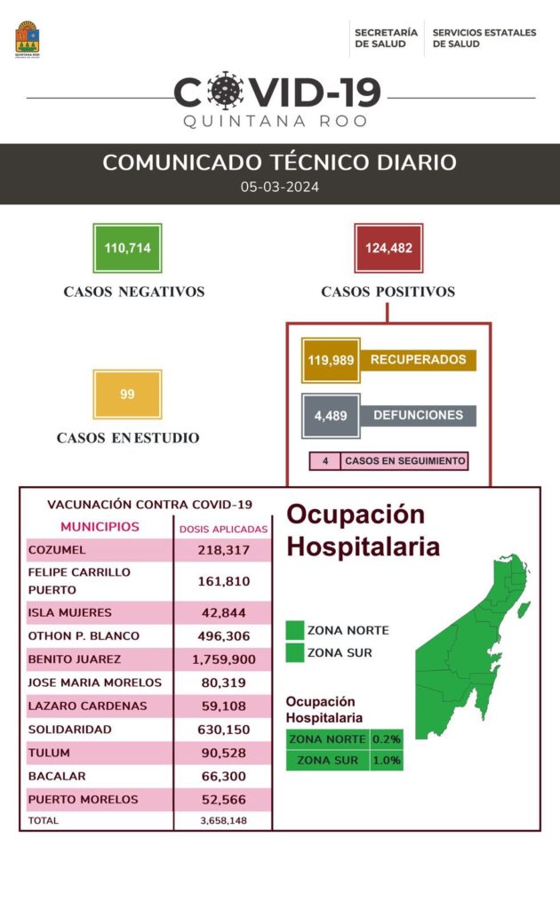 Hasta el 05 de marzo de 2024 han sido 124 mil 482 casos positivos de COVID-19 en Quintana Roo.